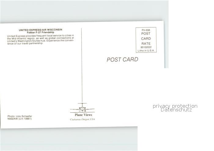 Flugzeuge Zivil United Express Air Wisconsin Fokker F-27 Friendship postalisch nicht gelaufen Erhaltung siehe scans