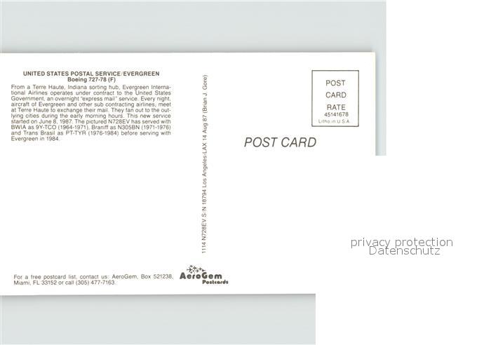 Flugzeuge Zivil United States Postal Service Evergreen Boeing 727-78 F postalisch nicht gelaufen Erhaltung siehe scans