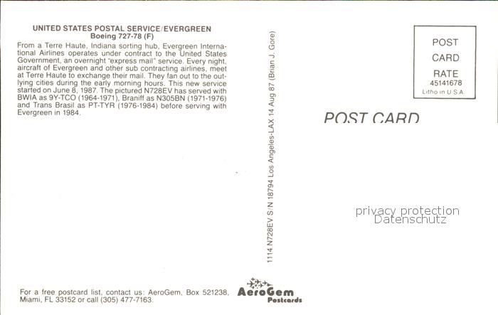 Flugzeuge Zivil United States Postal Service Evergreen Boeing 727-78F N728EV s/n 18794 postalisch nicht gelaufen Erhaltung siehe scans