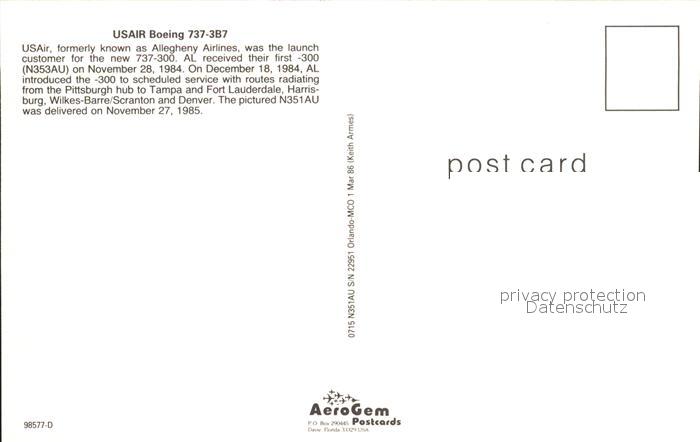 Flugzeuge Zivil US Air Boeing 737-3B7 N351AU S/N 22951 postalisch nicht gelaufen Erhaltung siehe scans