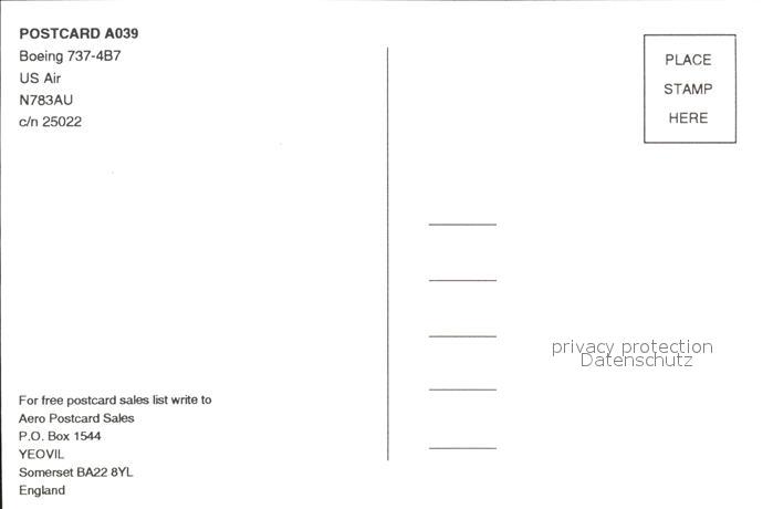 Flugzeuge Zivil US Air Boeing 737-4B7 N7863AU c/n 25022 postalisch nicht gelaufen Erhaltung siehe scans