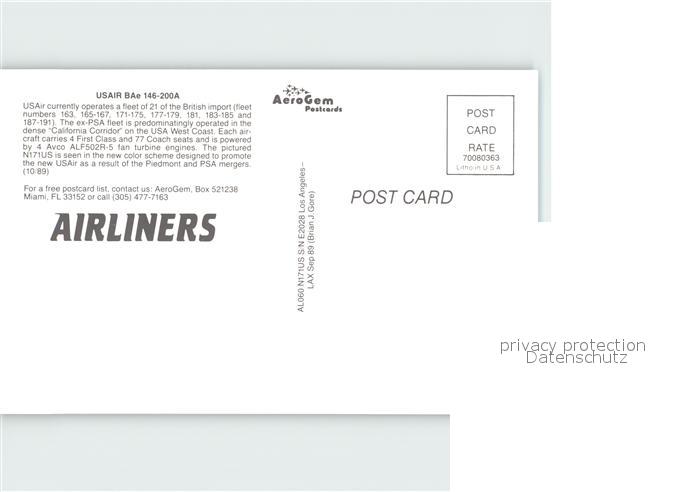 Flugzeuge Zivil USAir BAe 146-200A postalisch nicht gelaufen Erhaltung siehe scans