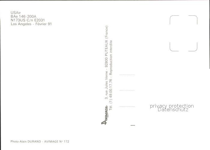 Flugzeuge Zivil USAir BAe 146-200A N173US C/n E2031 postalisch nicht gelaufen Erhaltung siehe scans
