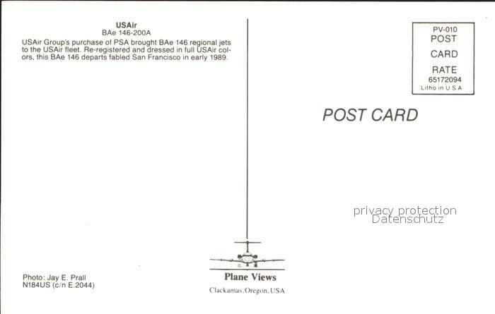 Flugzeuge Zivil USAir BAe 146-200A N184US c/n E.2044 postalisch nicht gelaufen Erhaltung siehe scans