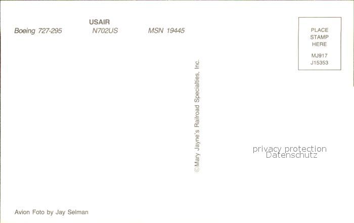Flugzeuge Zivil USAir Boeing 727-295 N702US postalisch nicht gelaufen Erhaltung siehe scans