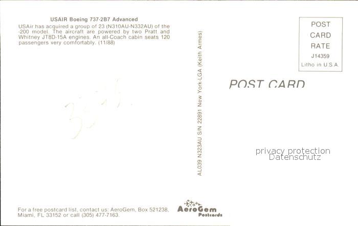 Flugzeuge Zivil USAIR Boeing 737-2B7 Advanced AL039 N323AU S/N 22891 postalisch nicht gelaufen