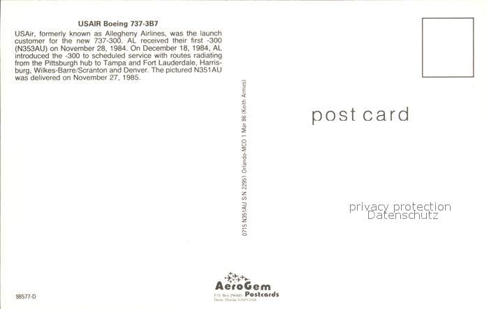 Flugzeuge Zivil USAIR Boeing 737-3B7 N351AU S/N 22951 postalisch nicht gelaufen Erhaltung siehe scans