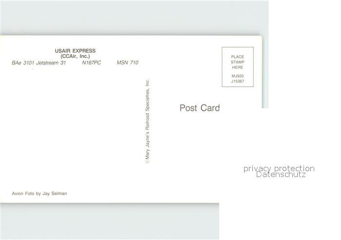 Flugzeuge Zivil USAir Express BAe 3101 Jetstream 31 N167PC MSN 710 postalisch nicht gelaufen Erhaltung siehe scans