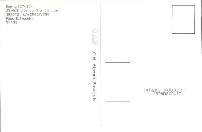 Flugzeuge Zivil USAir Shuttle col. Trump Shuttle Boeing 727-254 N916TS c/n 20437/798 postalisch nicht gelaufen Erhaltung siehe scans
