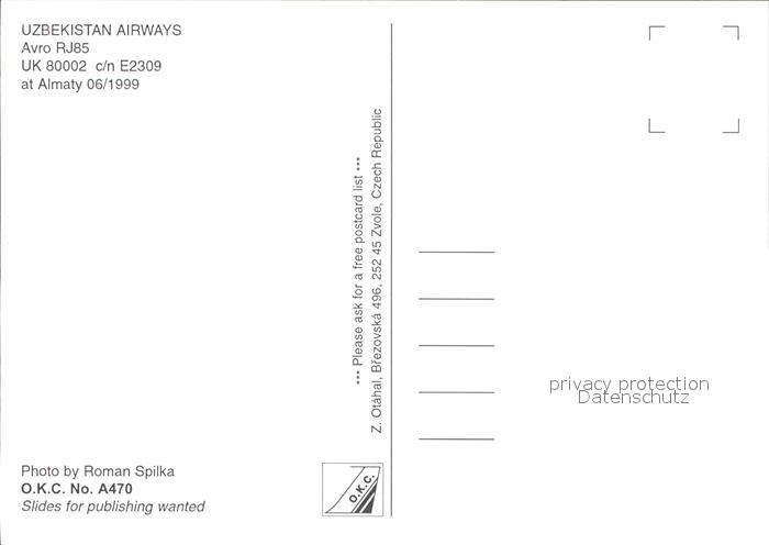 Flugzeuge Zivil Uzbekistan Airways Avro RJ85 UK 80002 c/n E2309 postalisch nicht gelaufen Erhaltung siehe scans