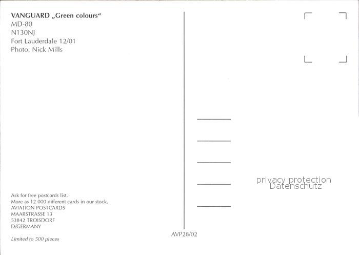 Flugzeuge Zivil Vanguard Green colours MD-80 N130NJ postalisch nicht gelaufen Erhaltung siehe scans
