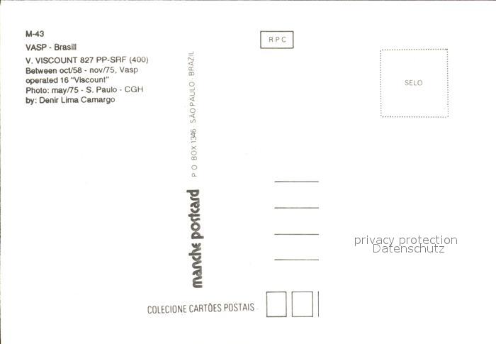 Flugzeuge Zivil VASP Brasil V. Viscount 827 PP-SRF postalisch nicht gelaufen Erhaltung siehe scans