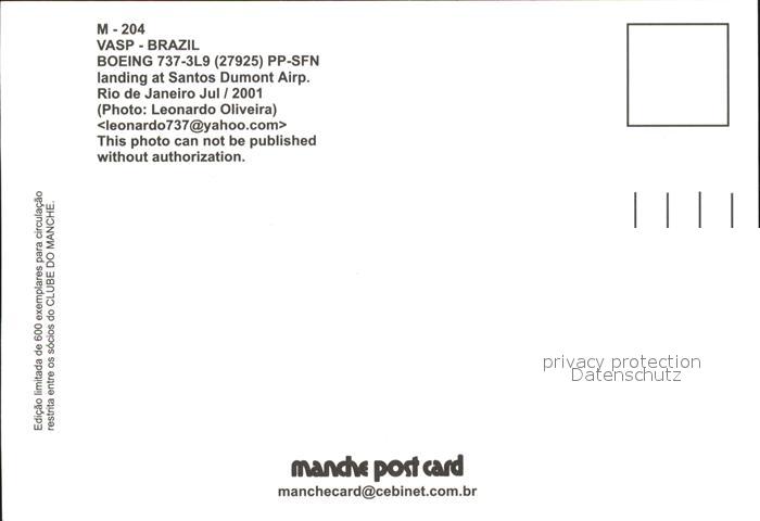 Flugzeuge Zivil VASP Brazil Boeing 737-3ol9 27925 PP-SFN postalisch nicht gelaufen Erhaltung siehe scans