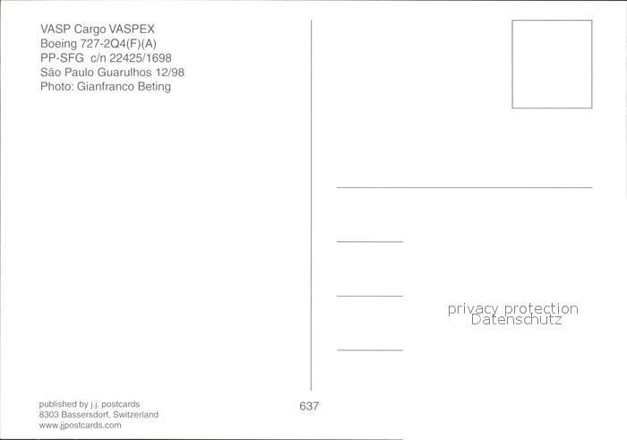 Flugzeuge Zivil VASP Cargp Vaspex Boeing 727-2Q4 PP-SFG c/n 22425/1698 postalisch nicht gelaufen Erhaltung siehe scans