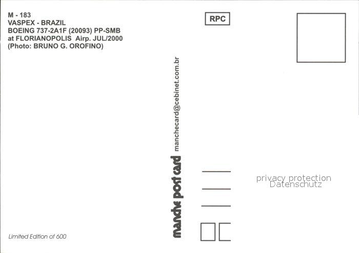 Flugzeuge Zivil Vaspex Boeing 737-2A1F 20093 PP-SMB postalisch nicht gelaufen Erhaltung siehe scans