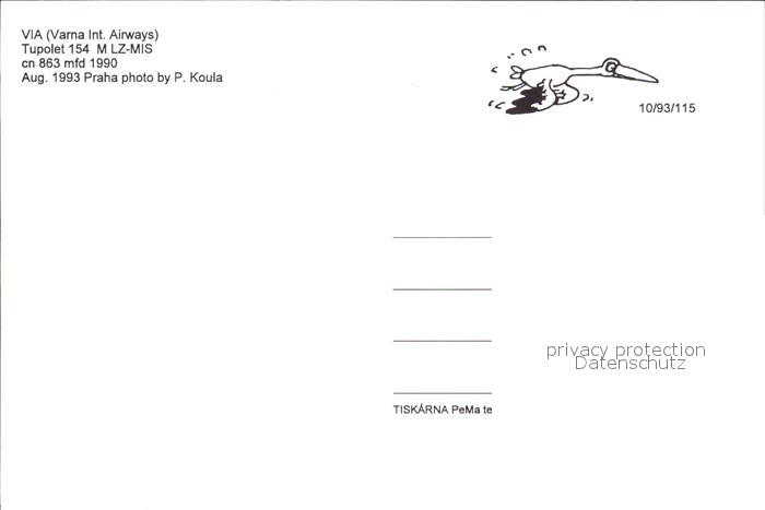 Flugzeuge Zivil VIA Varna Int. Airways Tupolet 154 M LZ-MIS cn 863 postalisch nicht gelaufen Erhaltung siehe scans