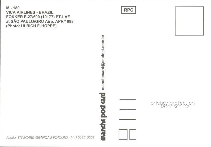 Flugzeuge Zivil Vica Airlines Fokker F-27/600 PT-LAF postalisch nicht gelaufen Erhaltung siehe scans