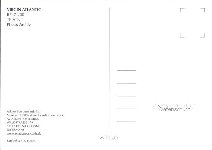 Flugzeuge Zivil Virgin Atlantic B747-200 TF-ATN postalisch nicht gelaufen Erhaltung siehe scans