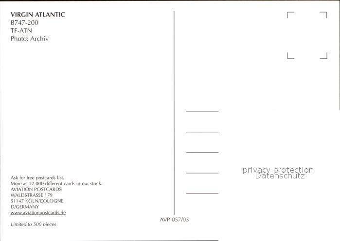 Flugzeuge Zivil Virgin Atlantic B747-200 TF-ATN postalisch nicht gelaufen Erhaltung siehe scans
