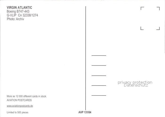 Flugzeuge Zivil Virgin Atlantic Boeing B747-443 G-VLIP cn 32338/1274 postalisch nicht gelaufen Erhaltung siehe scans
