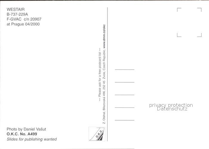 Flugzeuge zivil Westair B-737-229A F-GVAC c/n 20907 Prag postalisch nicht gelaufen Erhaltung siehe scans
