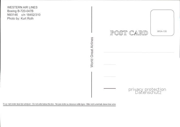 Flugzeuge Zivil Western Air Lines Boeing 720-047B N93146 c/n 18452/310 postalisch nicht gelaufen Erhaltung siehe scans