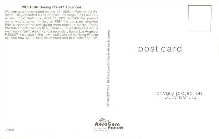 Flugzeuge Zivil Western Boeing 727-247 Advanced N2823W postalisch nicht gelaufen Erhaltung siehe scans