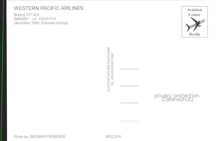 Flugzeuge Zivil Western Pacific Airlines Boeing 737-3L9 N960WP c/n 23331/1111 postalisch nicht gelaufen Erhaltung siehe scans
