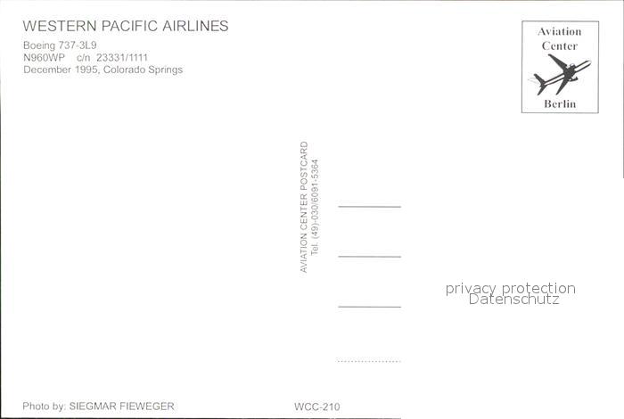 Flugzeuge Zivil Western Pacific Airlines Boeing 737-3L9 N960WP c/n 23331/1111 postalisch nicht gelaufen Erhaltung siehe scans