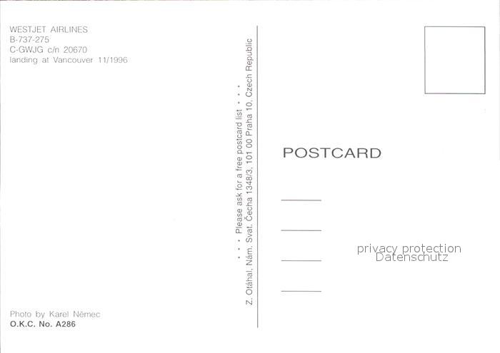 Flugzeuge Zivil Westjet Airlines B-737-275 C-GWJG c/n 20670 postalisch nicht gelaufen Erhaltung siehe scans
