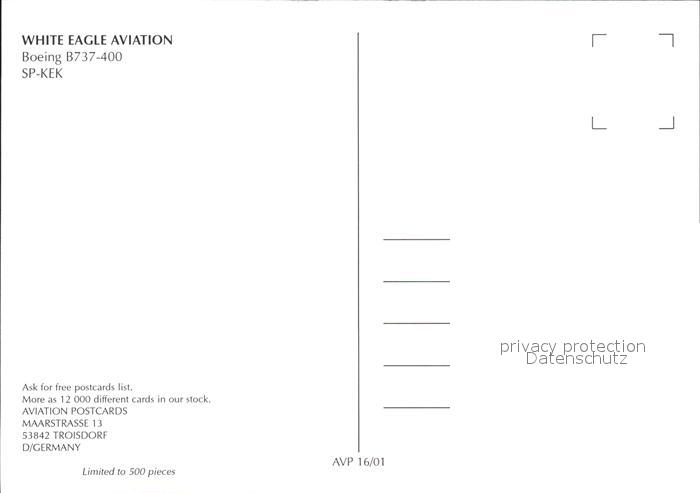 Flugzeuge Zivil White Eagle Aviation Boeing 737-400 SP-KEK postalisch nicht gelaufen Erhaltung siehe scans