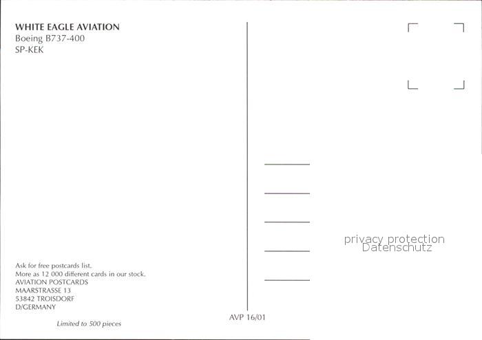Flugzeuge Zivil White Eagle Aviation Boeing B737-400 SP-KEK postalisch nicht gelaufen Erhaltung siehe scans