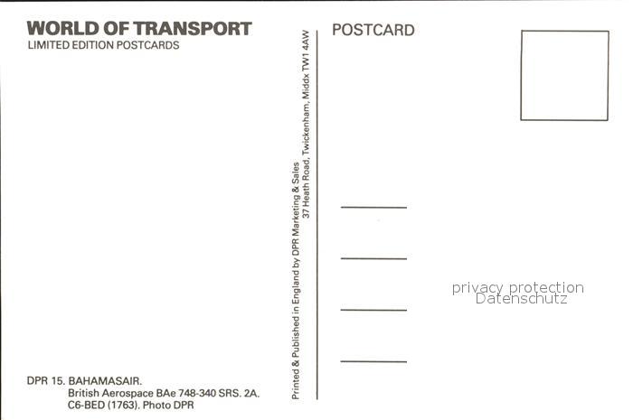 Flugzeuge Zivil World of transport Limited edition Postcards Bahamasair British Aerospace BAe 748-340 SRS 2A postalisch nicht gelaufen Erhaltung siehe scans