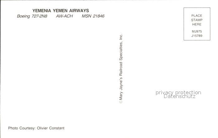 Flugzeuge Zivil Yemenia Yemen Airways Boeing 727-2N8 AW-ACH MSN 21846 postalisch nicht gelaufen Erhaltung siehe scans