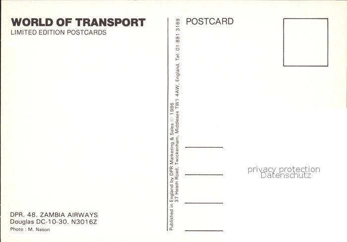 Flugzeuge Zivil Zambia Airways Douglas DC-10-30 N3016Z postalisch nicht gelaufen Erhaltung siehe scans