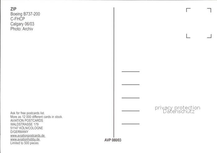 Flugzeuge Zivil ZIP Boeing 737-200 C-FHCP postalisch nicht gelaufen Erhaltung siehe scans