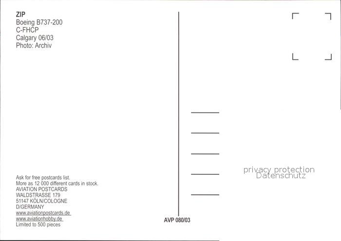 Flugzeuge Zivil ZIP Boeing B737-200 C-FHCP postalisch nicht gelaufen Erhaltung siehe scans
