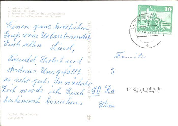 72324092 alte Postkarte Fockendorf Altenburg Konsum Stausee Gaststaette Badestrand Pahna Bad Zeltplatz postalisch gelaufen Erhaltung siehe scans KatCode: 11110016077005