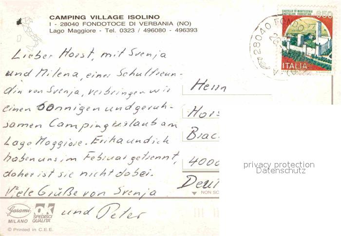 old postcard Fondotoce di Verbania Camping Village Isolino postalisch gelaufen Erhaltung siehe scans [NatalD47]