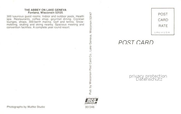 72982591 Fontana Wisconsin Abbey on Lake Geneva Abbey Resort & Spa postalisch nicht gelaufen Erhaltung siehe scans [FriedD77] KatCode: 14140520000000