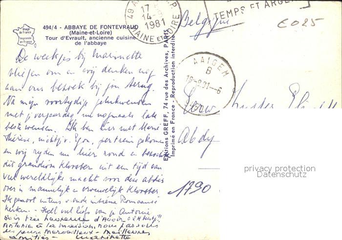 12483063 carte postale Fontevraud-l Abbaye Abbaye Tour d Evrault ancienne cuisine postalisch gelaufen Erhaltung siehe scans KatCode: 11170049349140