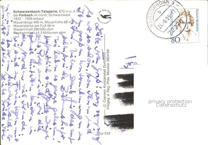 72396291 alte Postkarte Forbach Baden Fliegeraufnahme Schwarzenbach Talsperre postalisch gelaufen Erhaltung siehe scans KatCode: 11110008216013