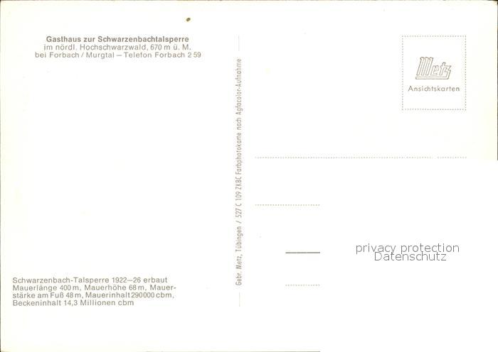 72580933 Forbach Baden Gasthaus zur Schwarzenbachtalsperre postalisch nicht gelaufen Erhaltung siehe scans [LiesaD40] KatCode: 11110008216013