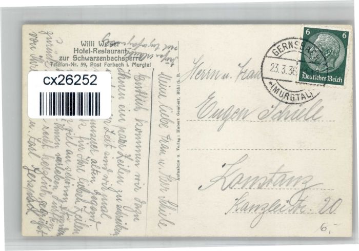 30838334 alte Postkarte Forbach Baden Hotel Restaurant Schwarzbachsperre postalisch gelaufen KatCode: 11110008216013