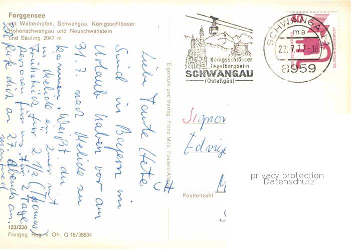 72725663 alte Postkarte Forggensee Schwangau Fliegeraufnahme mit Waltenhofen Schwangau Koenigsschloesser Hohenschwangeu Neuschwanstein Saeuling postalisch gelaufen Erhaltung siehe scans [LiesaD40] KatCode: 11110009777169