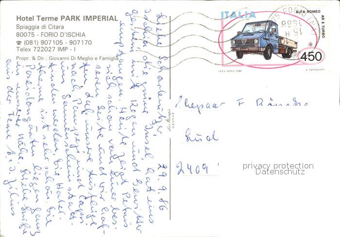 old postcard Forio d Ischia Hotel Terme Park Imperial postalisch gelaufen Erhaltung siehe scans