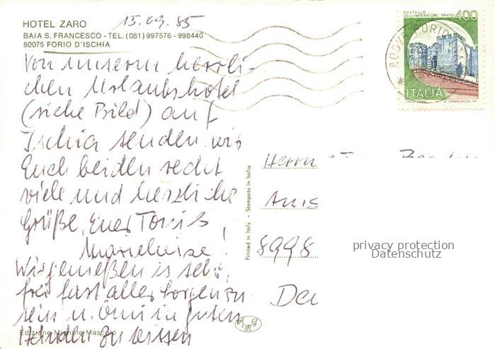 Forio d Ischia IT Hotel Zaro Baia San Francesco Fliegeraufnahme postalisch gelaufen Erhaltung siehe scans [WerneD78] alte Postkarte Wern Katcode 11240