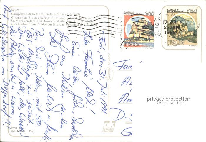 old postcard Forli Kirchenpartie mit Denkmal postalisch gelaufen Erhaltung siehe scans