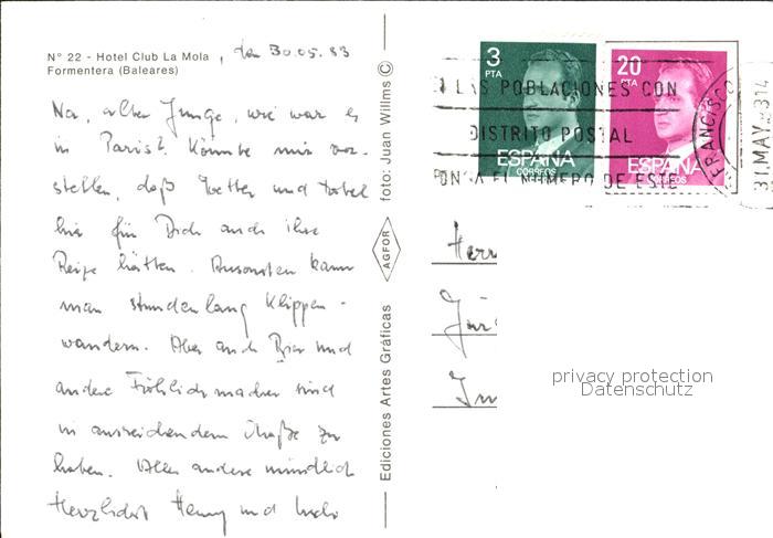 old postcard Formentera Hotel Club La Mola Tennisplatz Surfen postalisch gelaufen Erhaltung siehe scans