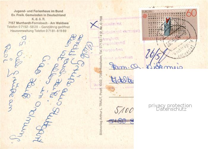 72989674 alte Postkarte Fornsbach Jugend und Ferienhaus der Ev Freikirchl Gemeinden postalisch gelaufen Erhaltung siehe scans [WerneD78] KatCode: 11110008119044